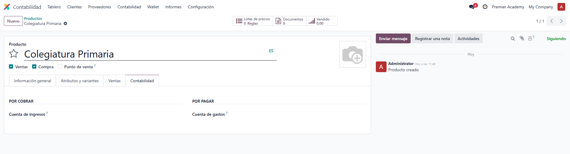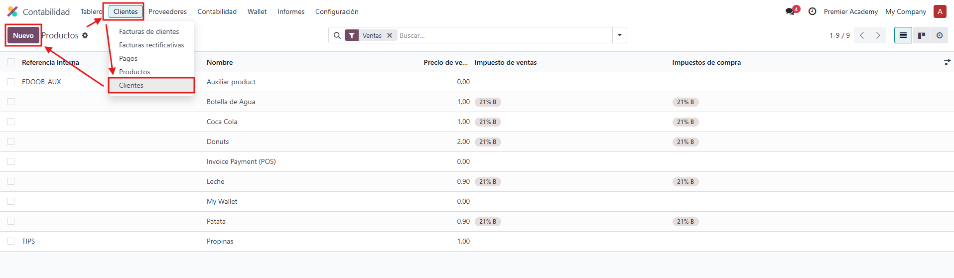 Contabilidad - Menú Clientes - Productos - Nuevo